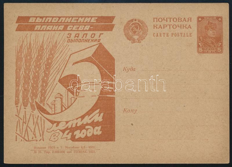 Soviet Union 1931 Unused propaganda PS-card